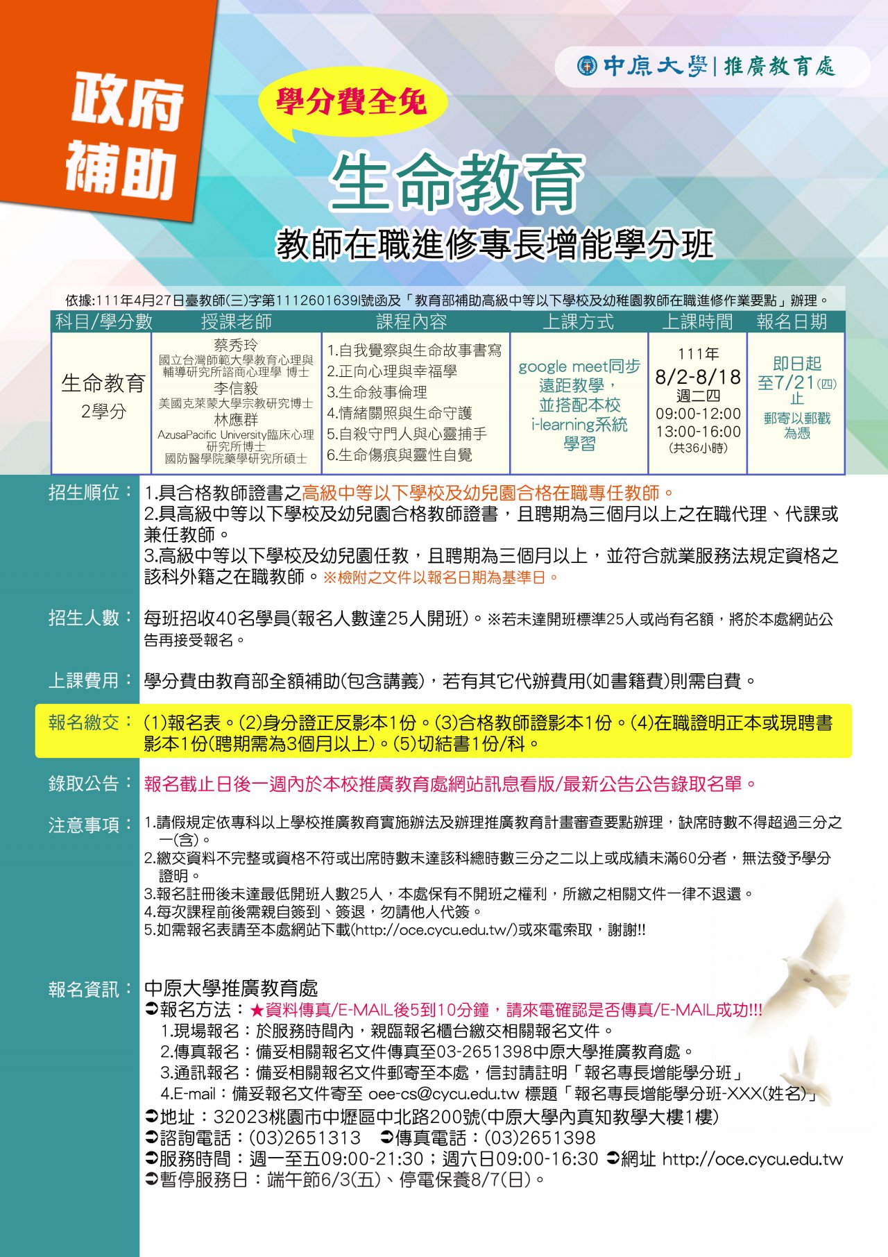 二、「生命教育」課程之報名截止日為 111 年 7 月 21 日,限額 40 名。