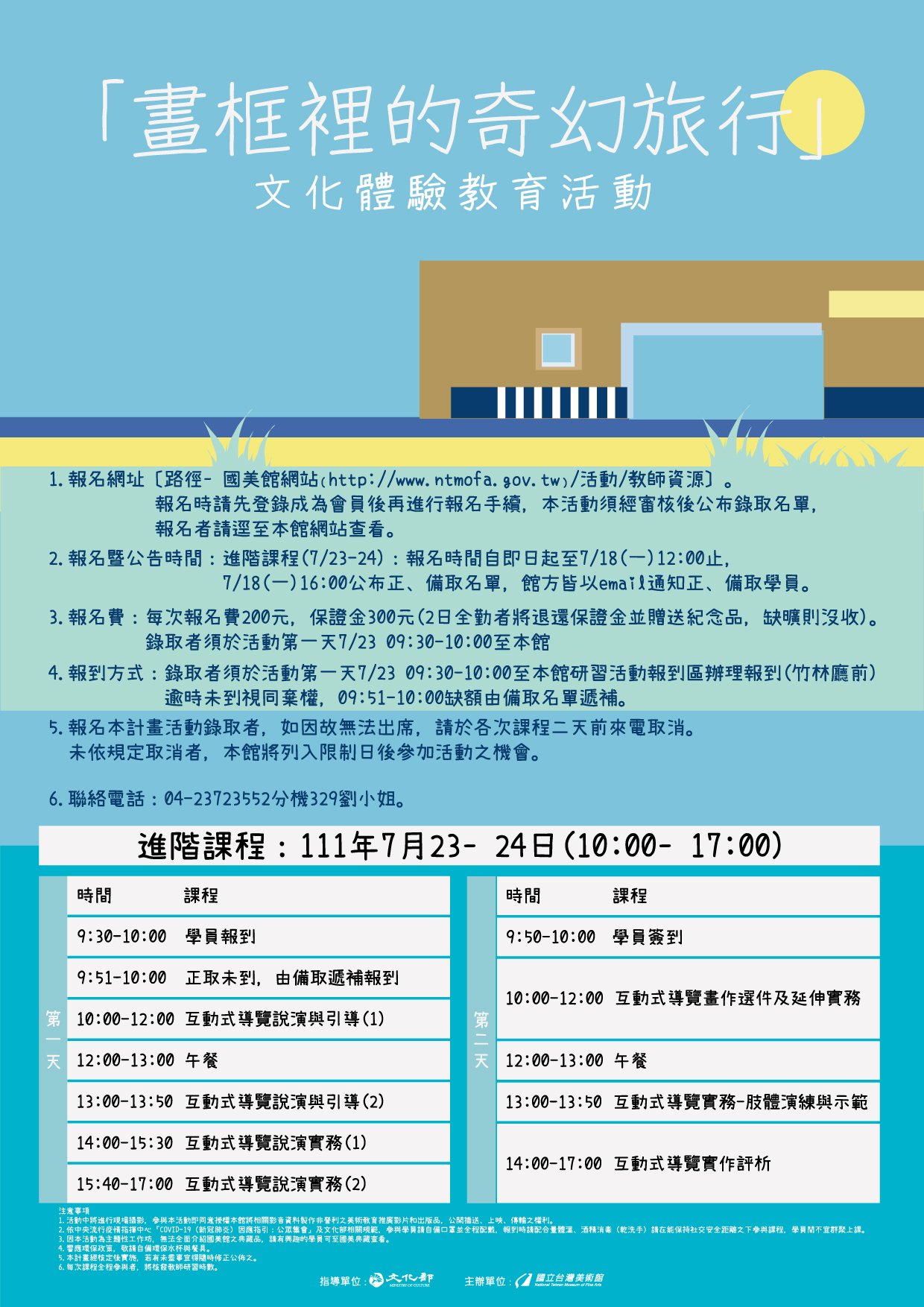 | 二、 | 旨揭活動分為兩梯次,分別訂於 111 年 7 月 12 日(二)-13 日(三)、 111 年 7 月 23 日(六)-24 日(日)於國立臺灣美術館 3 樓多元學藝廳辦理,有關活動內容及報名方式詳如簡章及活動網站。 |