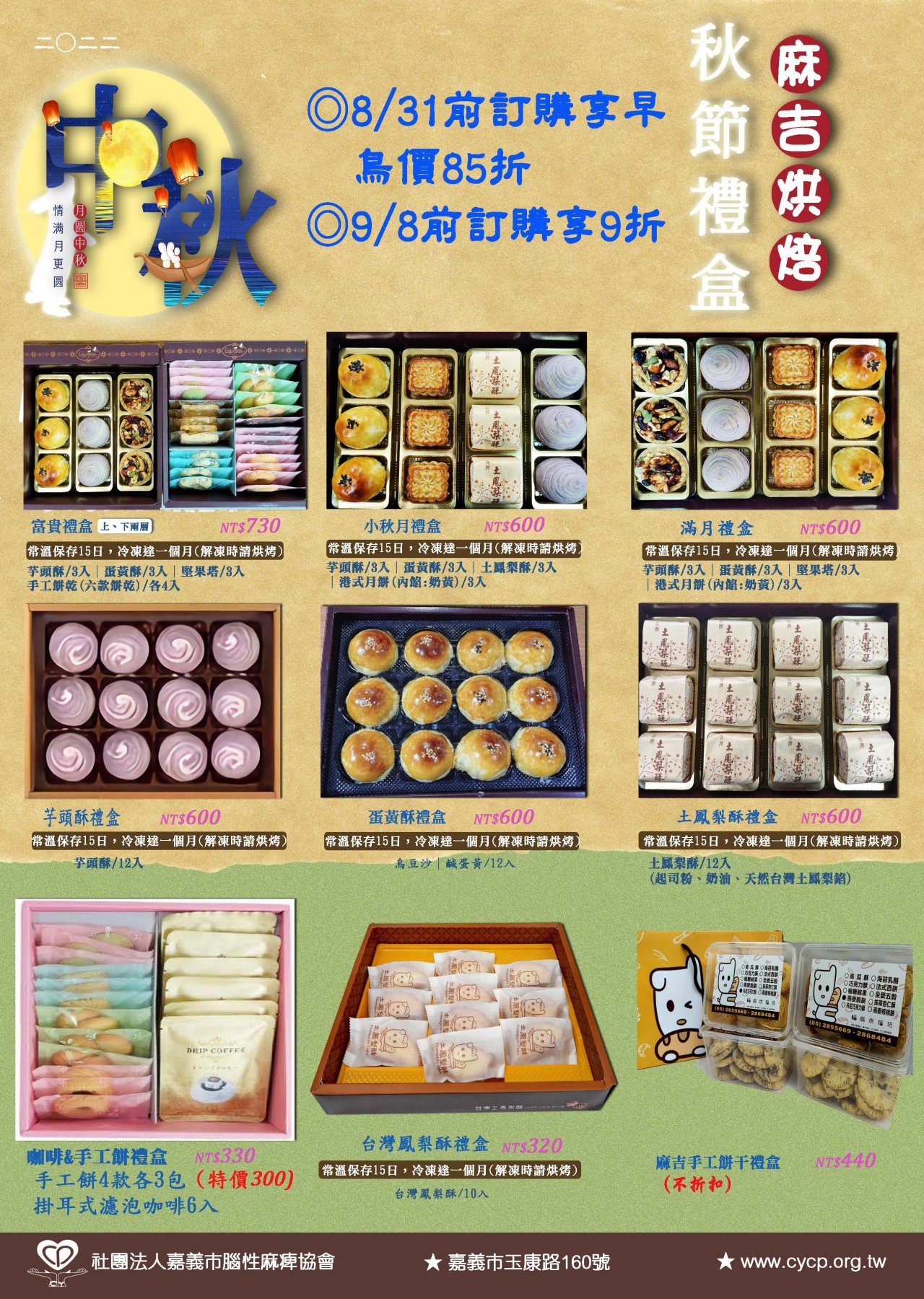 該市計有 5 家身心障礙福利機構、團體及庇護工場生產秋節禮盒,推出各式月餅糕點、蛋捲、手工餅乾、咖啡等等產品可供選擇,檢附該市 5 家身心障礙福利機構、團體及庇護工場秋節禮盒資料 1 份。