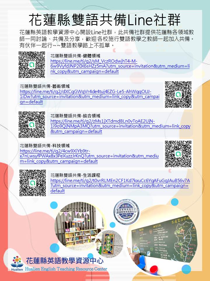 | 一、 | 為協助學校推動雙語教學,英語教學資源中心辦理跨校雙語教學共備社群,歡迎各校雙語教師加入,並於群組裡交流討論及分享雙語教學。有意願加入之教師請詳見附件(海報)上 Qrcode ,加入 line 群後有專人進行後續社群運作說明及討論。 |