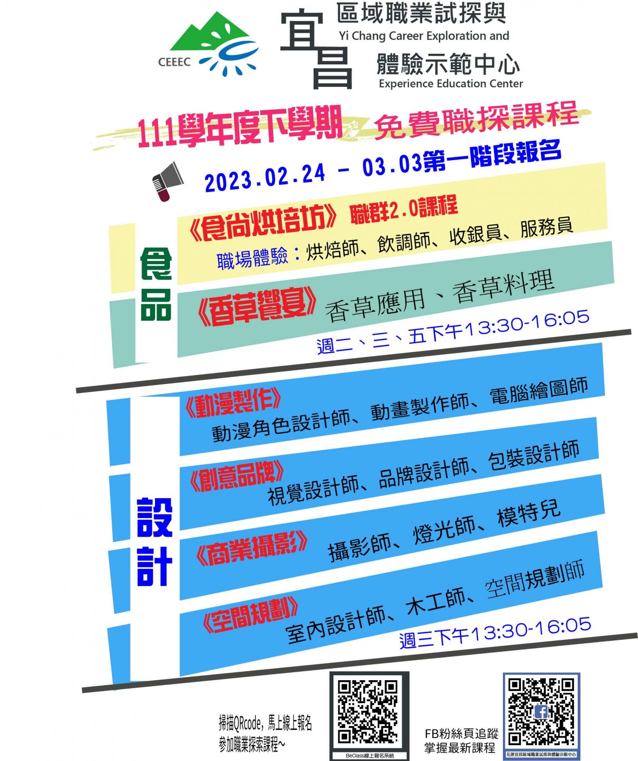| 主旨: | 函轉本縣宜昌國民中學開設花蓮縣區域職業試探與體驗示範 中心 111 學年度第二學期課程相關資料,鼓勵各校踴躍報名 參加,並請核予帶隊教師公假登記,請查照。 |