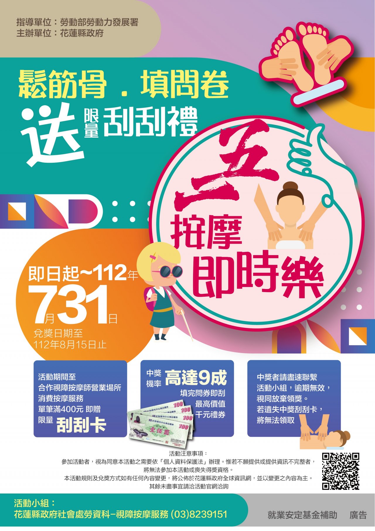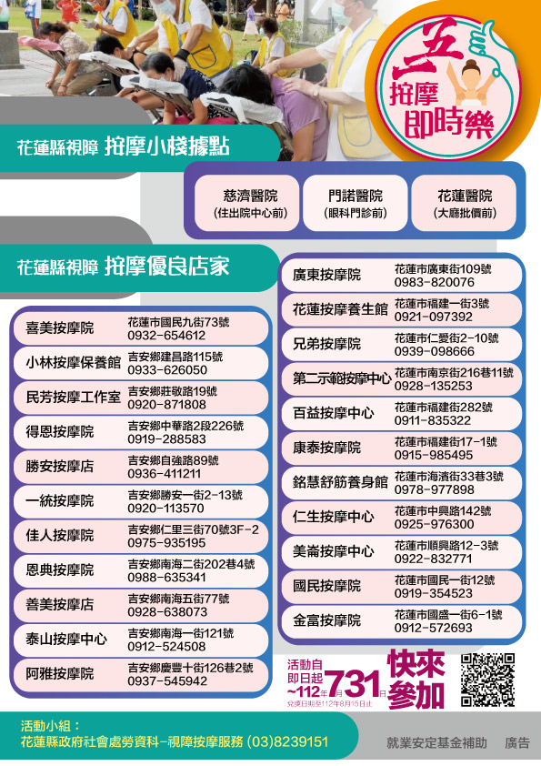 檢送本府112年度促進視障按摩行銷「五一按摩即時樂活動」宣傳海報及單張,惠請協助張貼並於官方網站公告周知,請查照。