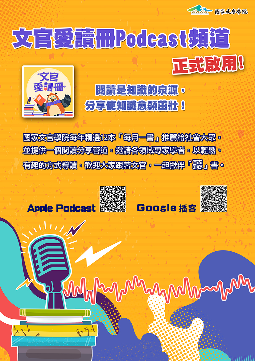 為擴大公務人員專書閱讀多元學習管道,國家文官學院成 立「文官愛讀冊」Podcast頻道,請轉知所屬同仁多加利 用,請查照。