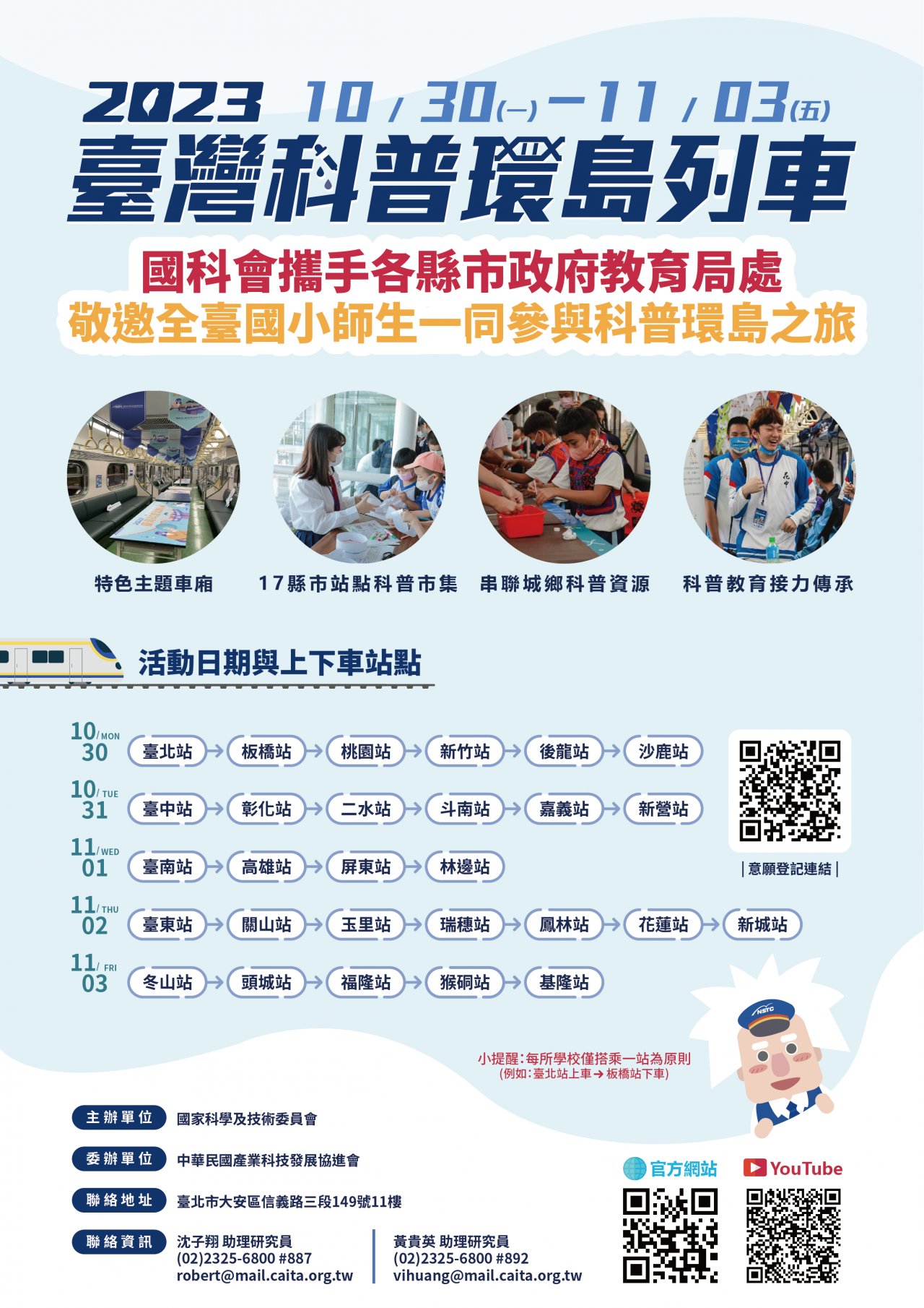 有關 「2023年臺灣科普環島列車」訂於112年10月30日至11月3日舉辦,邀請貴校踴躍參與,請查照。