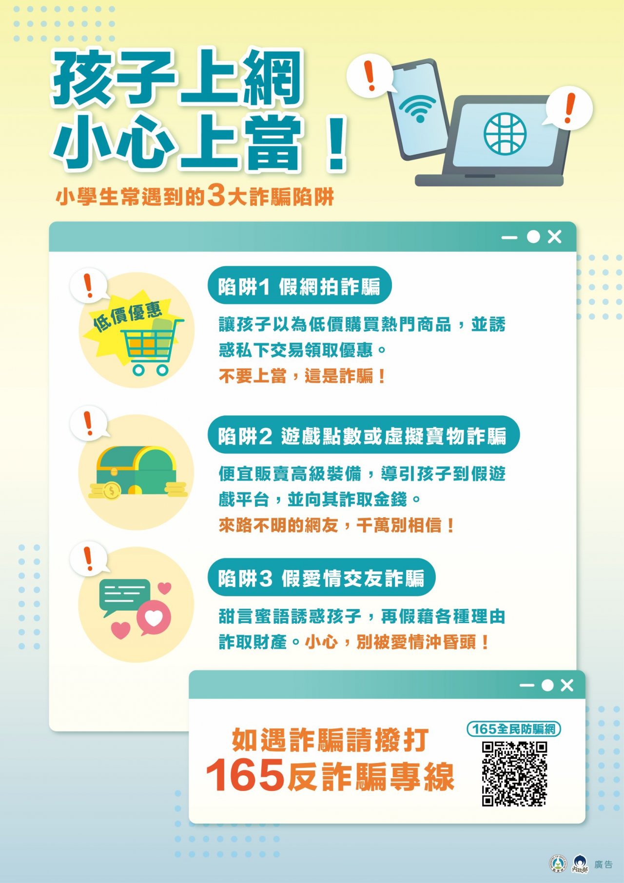 二、為提升學生及家長之防詐免疫力,以預防近期各式不斷翻 新的詐騙手法,教育部與內政部跨部會合作,區分不同年 齡教育階段分別製作「教育部與內政部-致家長的一封信」 (含反詐騙圖卡)國高中版及國小版各 1 份,以整體性提升 學生及家長識詐之能力,避免成為詐騙受害者。