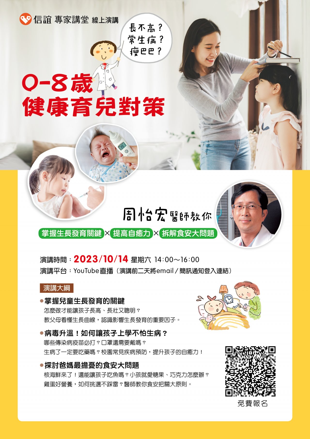 | 一、 | 孩子平安與健康是父母與老師的最大心願。但是,孩子入學後經常生病,我們該如何預防並提高自癒力?秋冬正值各種病毒蔓延,【信誼專家講堂】特別邀請小兒醫學專家~周怡宏醫師進行專題演講,周醫師將以 30 年的醫學知識與臨床經驗,傳授父母健康育兒的對策。。 |