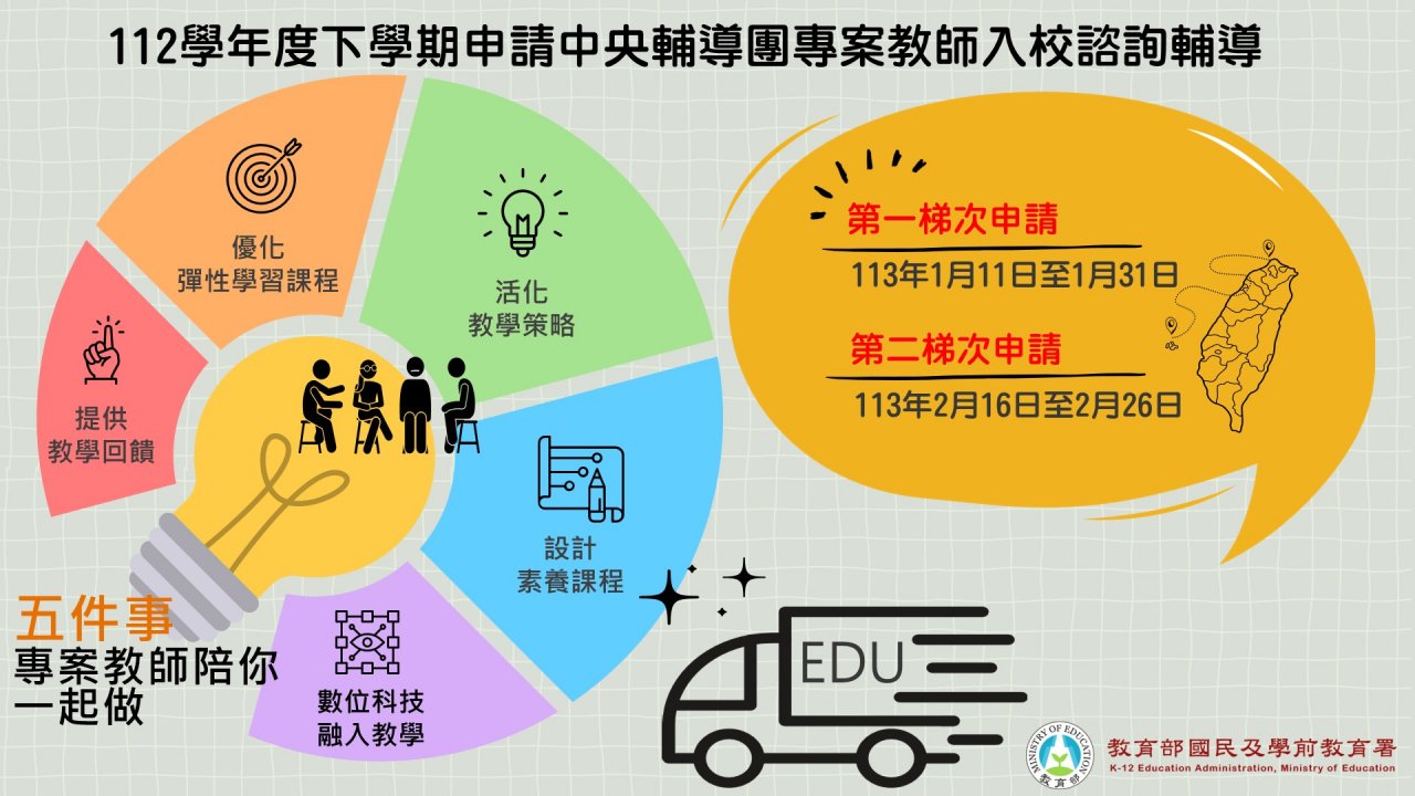 | 二、 | 為推動新課綱素養導向之課程與教學,以培育具備核心素養能力之學生,國教署規劃「112 學年度中央課程與教學輔導諮詢教師團隊專案教師實施計畫」,學校可申請 112 學年度下學期中央輔導團專案教師到校陪伴(詳如附件說明),簡要說明如下: |