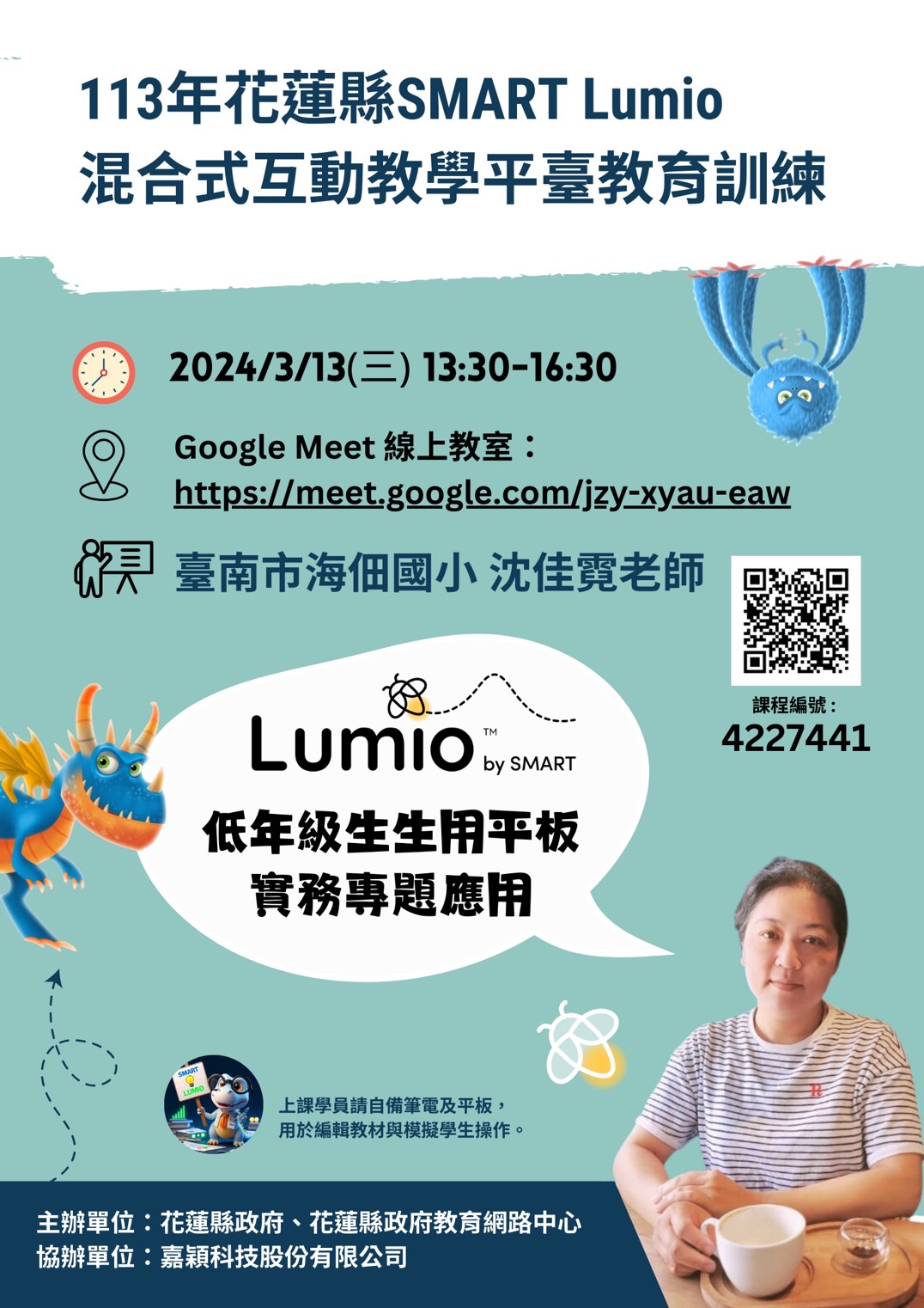 | 二、 | 旨揭研習為增進本縣國民中小學數位學習能力,提升教師運用數位科技及資源實施教學之能力,講師以教學現場的角度分享活動設計及應用方式增進教師 SMART Lumio 的認知;協助各校導入使用 SMART Lumio 線上互動教學平台,並推廣本縣採購無上限帳號申請資訊,研習資訊如下: |