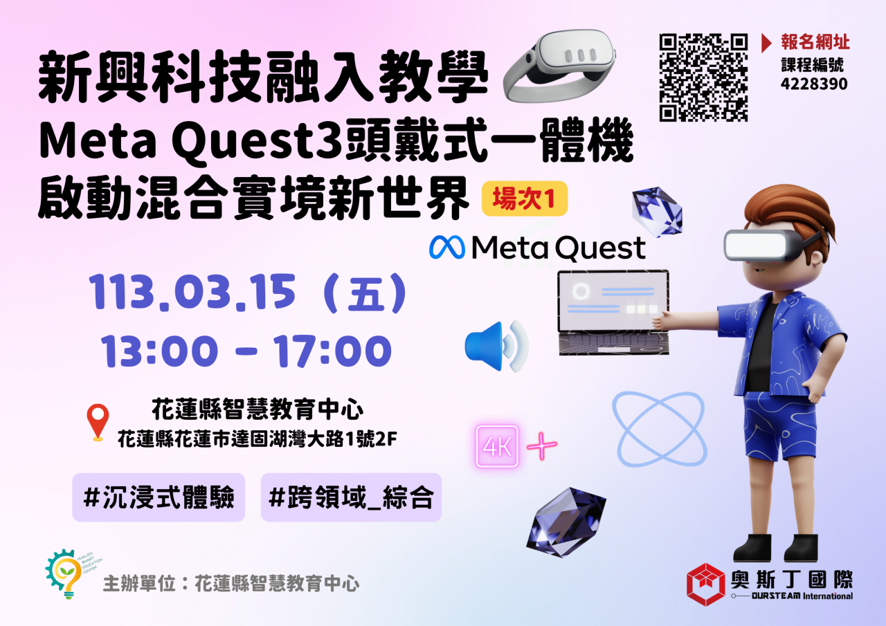 | 二、 | 旨揭研習為增進本縣國民中小學數位學習能力,提升教師運用數位科技及資源實施教學之能力,透過 Meta Quest3 頭戴式虛擬實境一體機實際操作混合實境模式並發展沉浸式體感教學內容,研習資訊如下(共辦理 2 場次;第 1 場次為基礎操作及混合實境體驗、第 2 場次為混合實境體驗及相關教學應用。): |