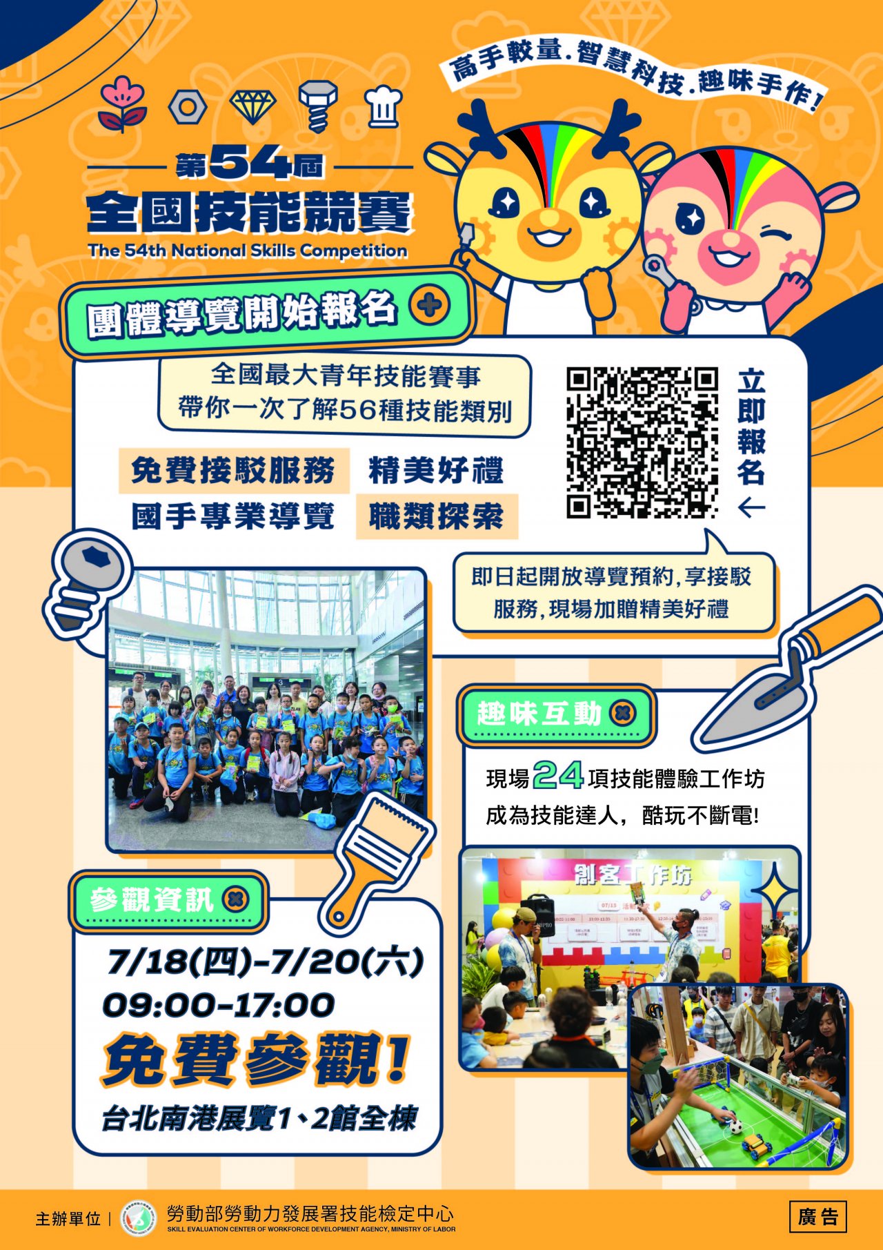 | 二、 | 旨揭競賽活動訂於 113 年 7 月 18 日(星期四)至 7 月 20 日(星期六)假臺北市南港展覽館 1 、 2 館(臺北市南港區經貿二路 1 、 2 號)舉辦,本次辦理青年組 56 職類與青少年組 13 職類,共計 69 職類,為職業訓練與技職教育之年度盛事。 |