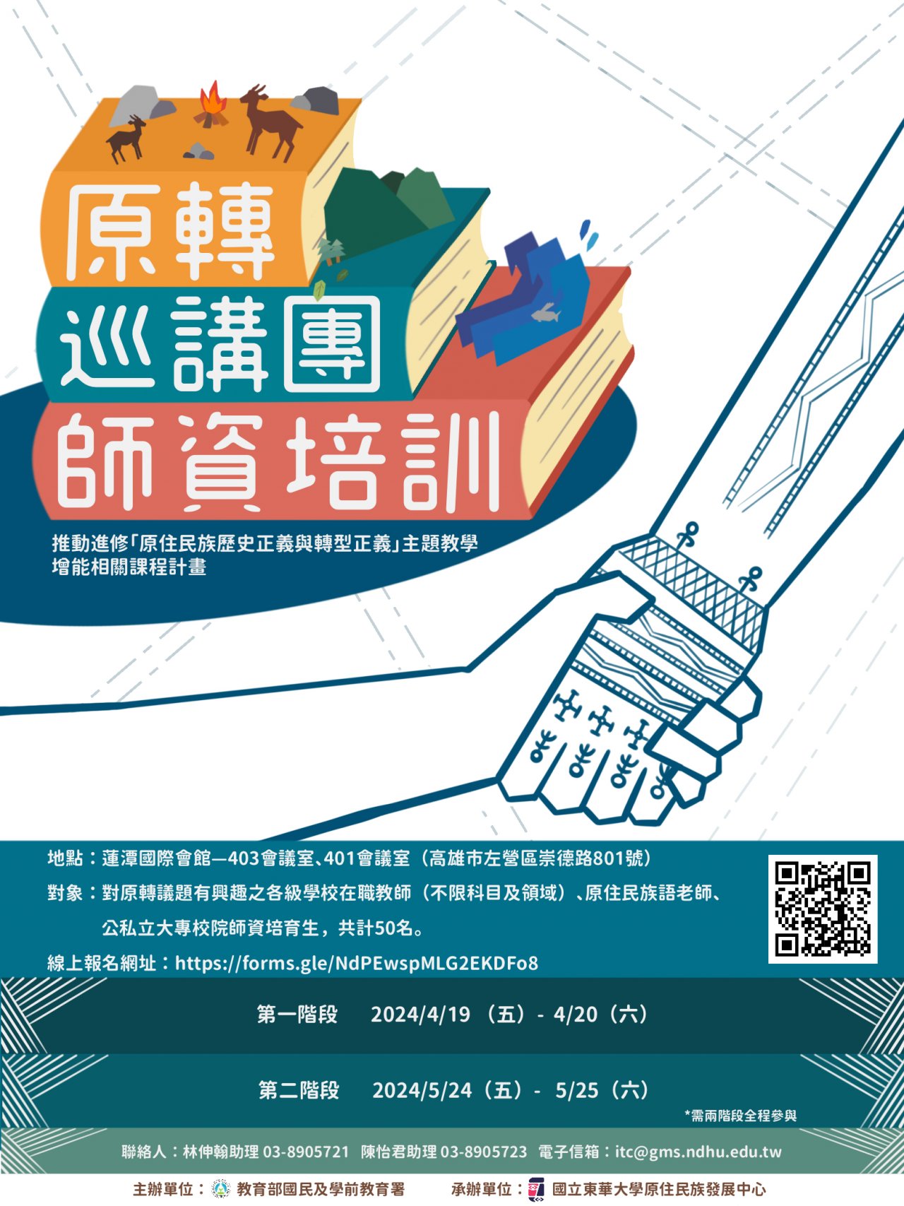 | (三) | 培訓對象:對原轉議題有興趣之各級學校在職教師(不限科目及領域)、原住民族語老師、公私立大專校院師資培育生,共計 50 名。培訓成員完整參與兩階段課程及交付作業者,即授予研習證書與成為原轉巡講團師資。 |