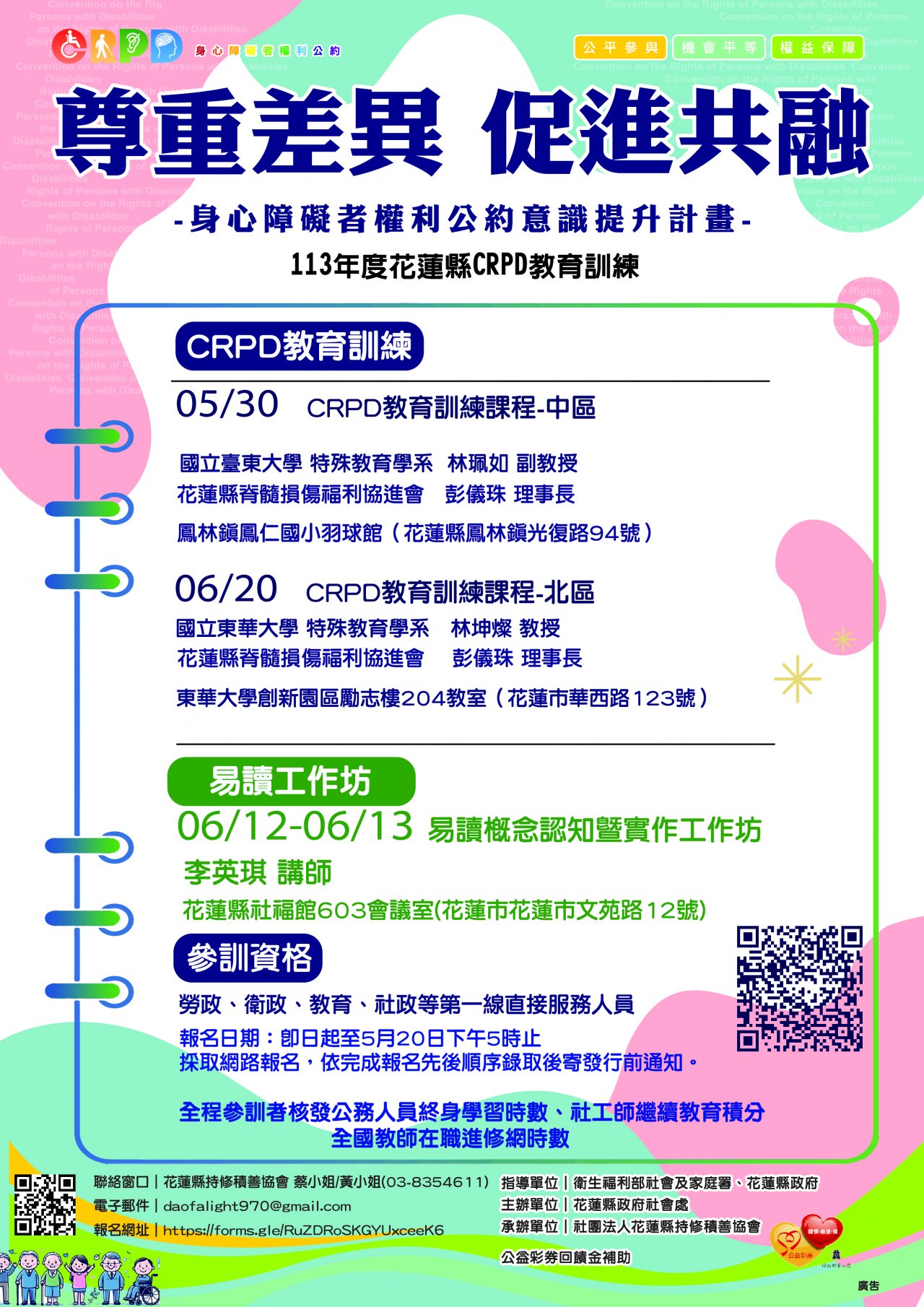 - 報名方式:即日起至 5 月 20 日下午 5 時止,報名網址: https://reurl.cc/ZWd6Ma ,倘有報名疑問請洽 03-8354611 蔡小姐/黃小姐。全程參訓者核發公務人員終身學習時數、社工師繼續教育積分及全國教師在職訓練時數。