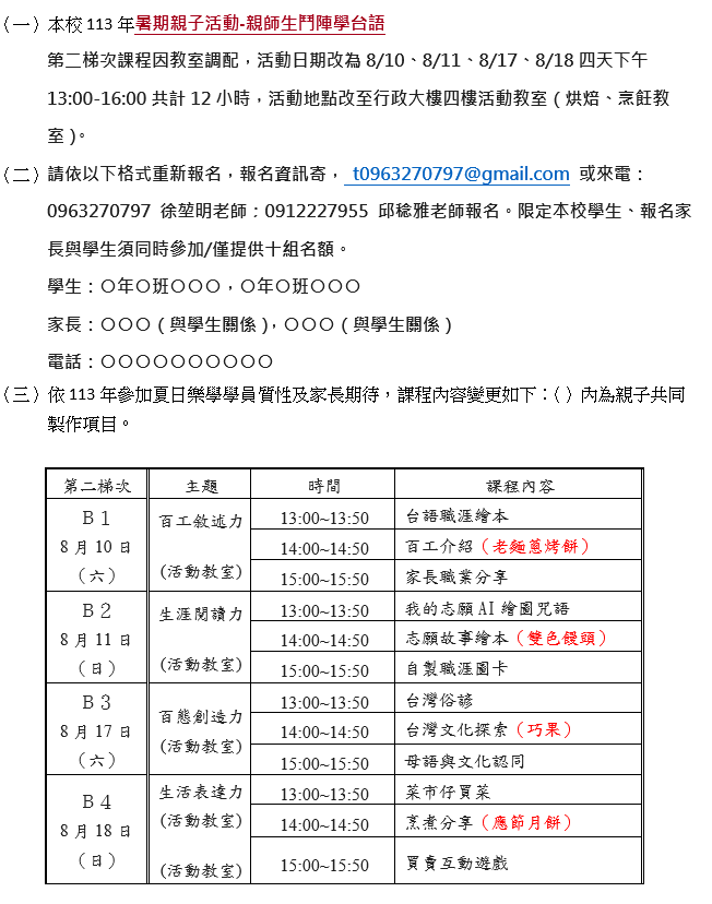 - 請依以下格式重新報名,報名資訊寄, t0963270797@gmail.com 或來電: 0963270797 徐堃明老師; 0912227955 邱稔雅老師報名。限定本校學生、報名家長與學生須同時參加/僅提供十組名額。