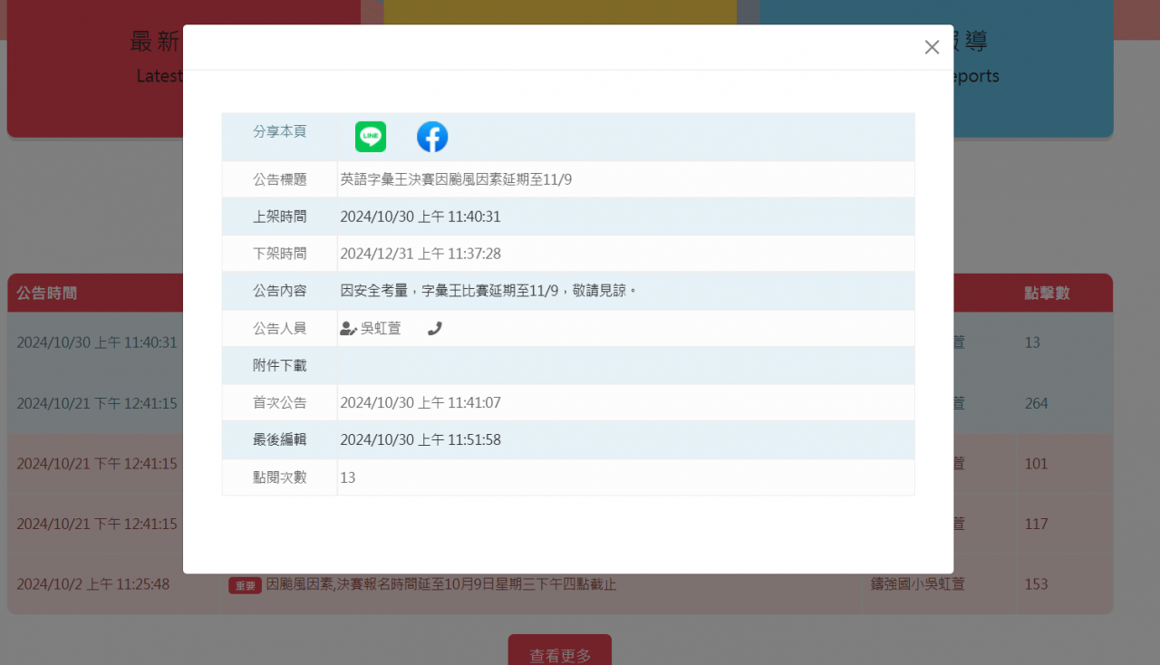 轉知113年花蓮縣英語字彙王競賽因康芮颱風因素延期至11/9辦理比賽