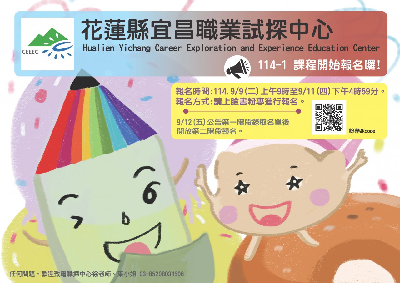 五、 報名方式:請逕至宜昌國中校網,或於「花蓮縣宜昌區域職業試探與體驗示範中心」粉專點選報名連結 https://reurl.cc/Yk0xao 。亦可掃描海報 QR code 報名。