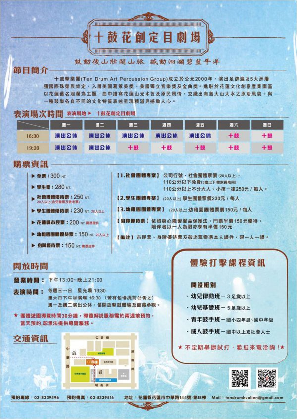 花蓮文創園區位於中華路 144 號,由花蓮舊酒廠修整而成,是文化部在台推動的五大文化創意產業園區之一。十鼓擊樂團於 2016 年進駐花蓮文創園區第 18 棟酒包裝工廠所改造全新 4D 雙旋轉舞台,熱情邀情師生蒞臨花蓮文創園區-十鼓花創定目劇場。
