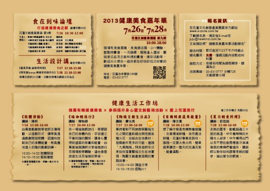 一年一度於花蓮的觀光美食盛會,將於今年7月26日至28日早上10點至晚上6點假花蓮文化創意產業園區隆重登場。文創食堂從「表演‧藝術‧餐飲‧服務」四個面向上菜,讓一般民眾體驗文創藝術並能將健康美食的忠旨「健康‧衛生‧安全」落實於生活面。活動內容有論壇、工作坊、講座、展覽、微電影、一元競標、公益拍賣會等,本次健康美食示範陣容強大,25家觀光飯店及餐飲業齊聚,秀出超值餐券及住宿方案,慢一步就搶購一空囉!