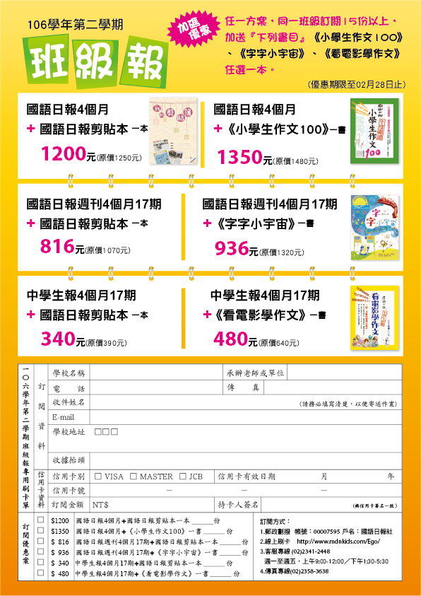 本社即日起推出「106-2 學期班級報」優惠訂閱專案,此案訂閱期間為 4 個月。