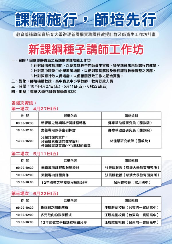 國立東華大學師資培育中心辦理「課綱施行,師培先行-種子講師工作坊」活動,請教師踴躍報名參加。