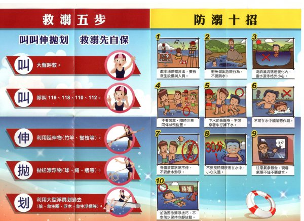 鑒於暑假期間 7 、 8 月往往為學生發生溺水事件的高峰期,教育部呼籲各界謹記「救溺」口訣 「叫叫伸拋划,救溺先自保」: