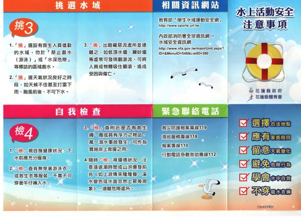 教育部將防溺、救溺的重要觀念歸納成「救溺五步、防溺十招」,並設計成摺頁,提供給全國中小學(檔案於「游泳 121 網站」下載,網址: http://www.sports.url.tw/),希望各校務必在學生離校前,再次叮嚀學生注意水域活動安全。
