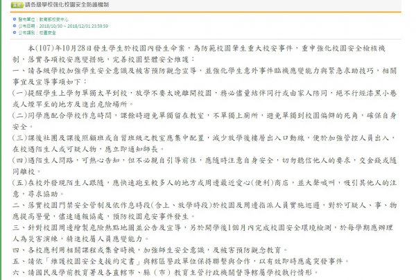 本(107)年 10 月 28 日發生學生於校園內發生命案,為防範校園肇生重大校安事件,重申強化校園安全檢核機制,落實各項校安應變措施,完善校園整體安全維護: