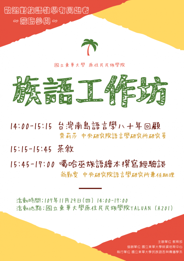 | 四、 | 本工作坊特邀國中小族語專職教師參與,請主聘學校本權責准予公(差)假辦理,代課費得另案向本府申請;工作坊時數可抵免族語專職教師研習時數。 |