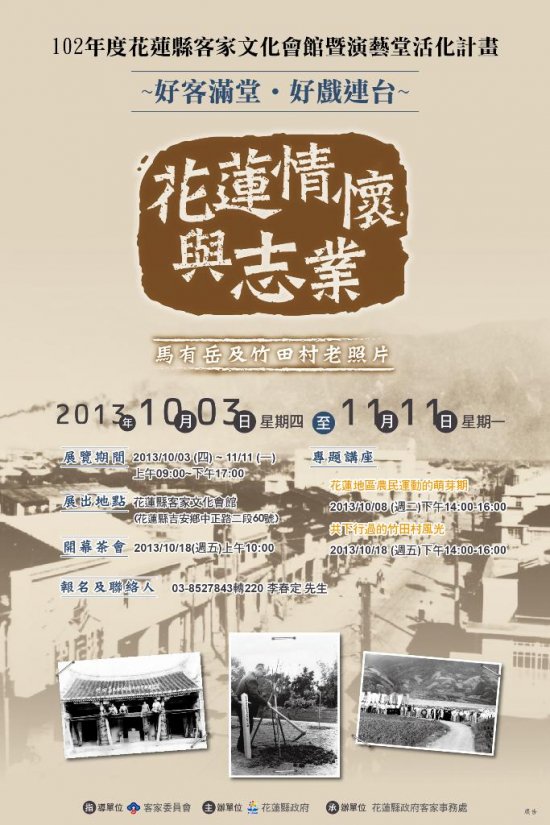 | 主旨: | 為推廣客家藝文、促進多元文化發展,訂於 102 年 10 月 3 日(週四)至 11 月 11 日(週一)假花蓮縣客家文化會館(花蓮縣吉安鄉中正路二段 60 號,南埔加油站後方)辦理「花蓮情懷與志業-馬有岳及竹田村老照片」,惠請參觀。 |