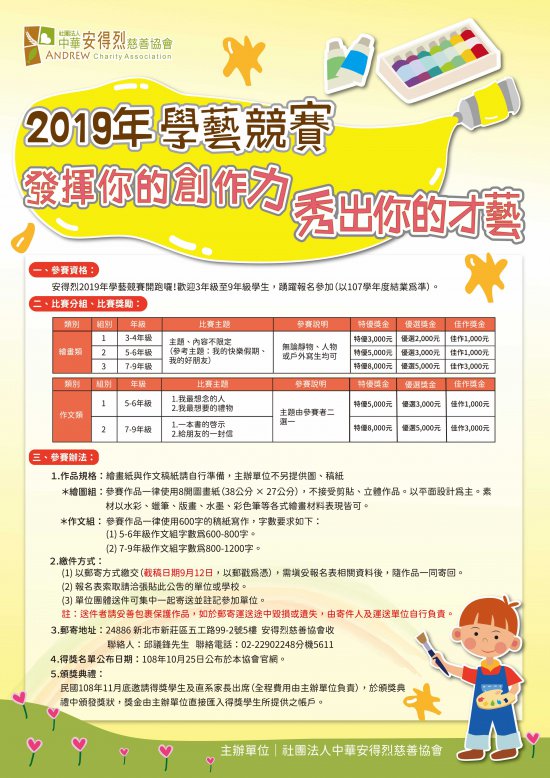 一、社團法人中華安得烈慈善協會為增進偏鄉、弱勢家庭兒少閱讀寫作及美術繪畫的興趣與能力,特別舉辦「作文、繪畫」之學藝競賽活動,以激發孩子們在文字與繪畫藝術方面的想像力與創作力,鼓勵有志於相關領域創作的孩子們發揮才華。
