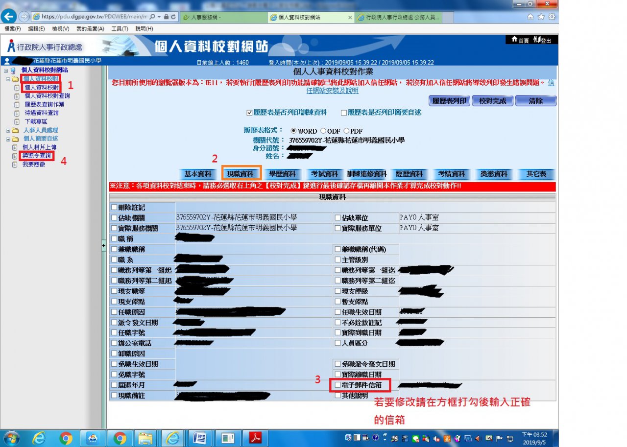 二、若已經本室核頒電子獎令,卻都沒有收到mail通知,可於B5>個人資料校對>現職資料圖二1-3中修改電子郵件信箱。