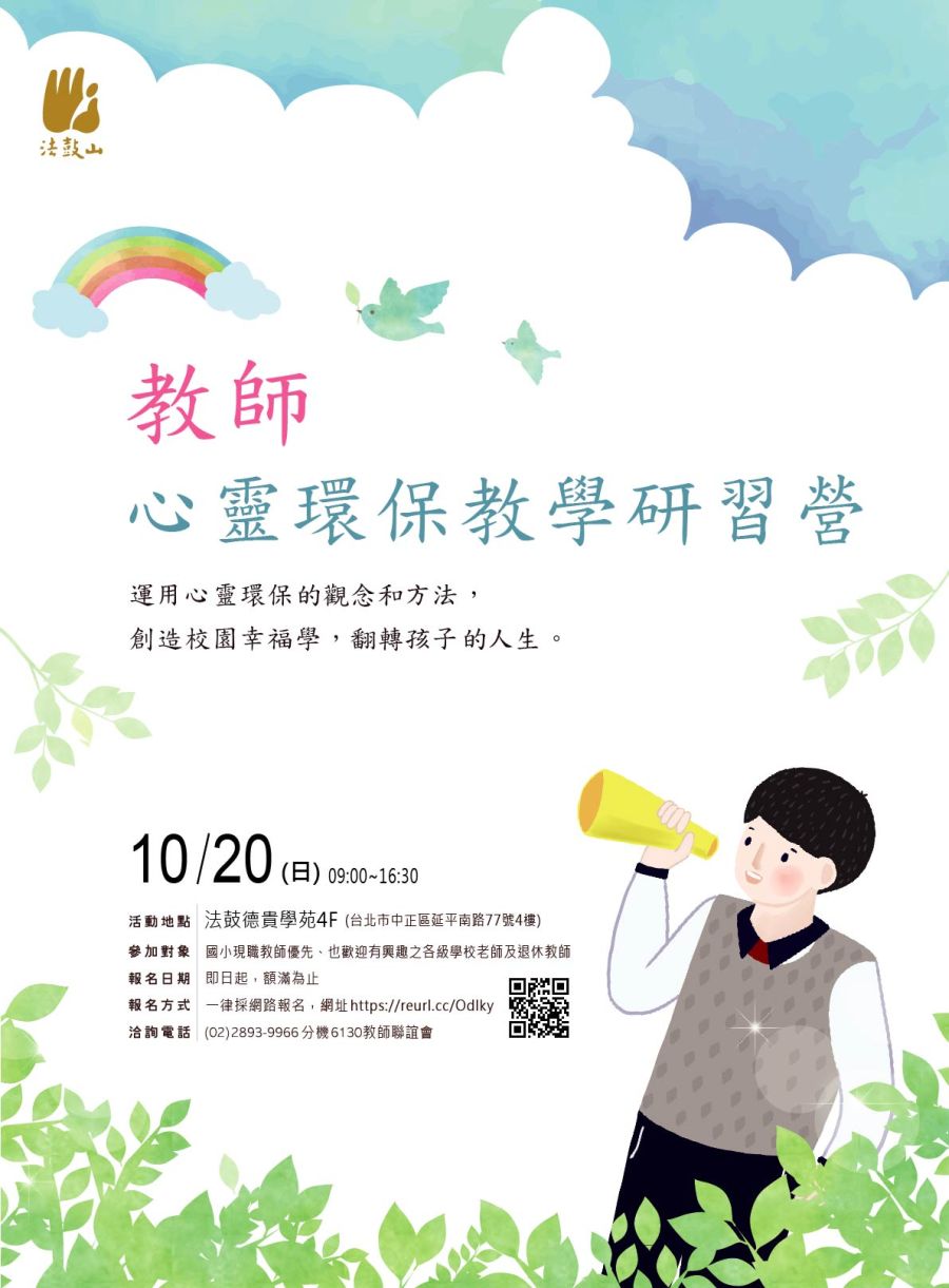 法鼓山佛教基金會訂於108年10月20日(日)辦理「教師心靈環保教學研習營」活動,詳如說明。