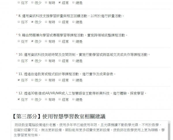 (五)補充說明:從第8題至12題勾選(很少或從不),就不需要上傳佐證資料(判定層級為互動教學)!