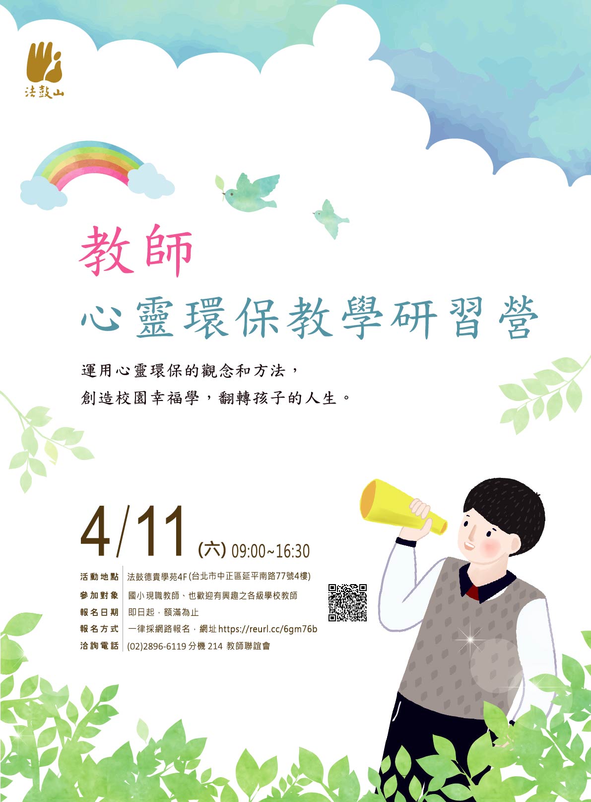 法鼓山佛教基金會訂於109年4月11日(六)辦理「教師心靈環保教學研習營」活動,詳如說明。
