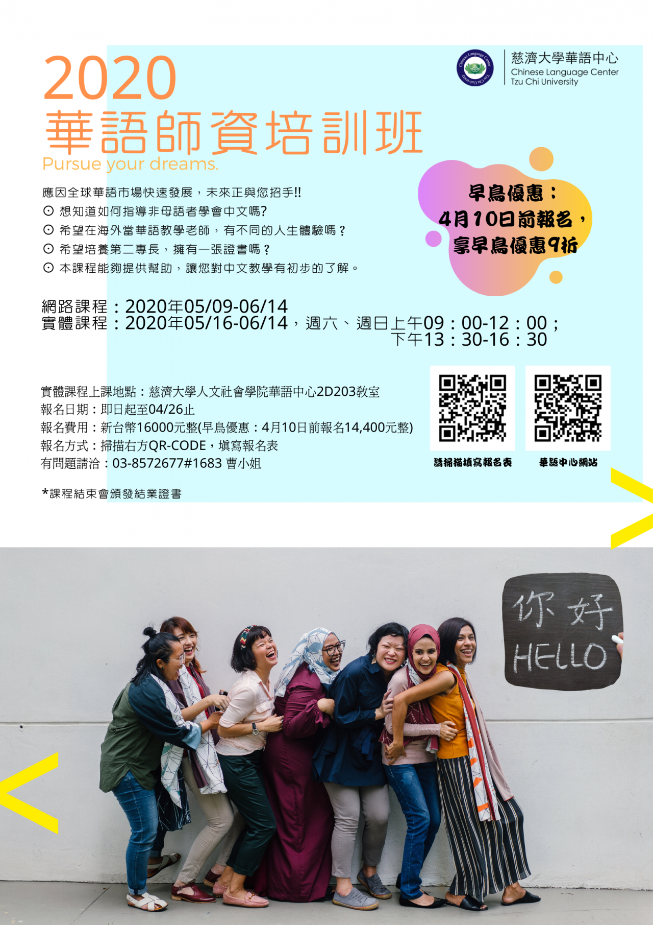| 一、 | 本校華語中心開辦之「2020 華語文師資培訓-花蓮班」招生,報名截止日期 為 109 年 4 月 26 日。本課程實體課程自 109 年 5 月 16 日至 6 月 14 日止,每週六、日上午 9:00-12:00 及下午 13:30-16:30 ,網路課程自 5 月 9 日-6 月 14 日止,於帳號有效期限內不限次數觀看。課程詳情請見附件簡章(詳見附件),如課程有更新內容請參考中心網頁 http://www.language.tcu.edu.tw/。 |