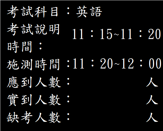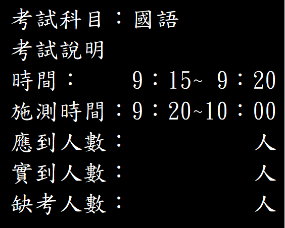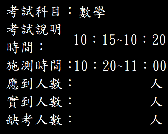 (五) 考試科目、時間、應到人數、實到人數、缺考人數請寫在黑板上。