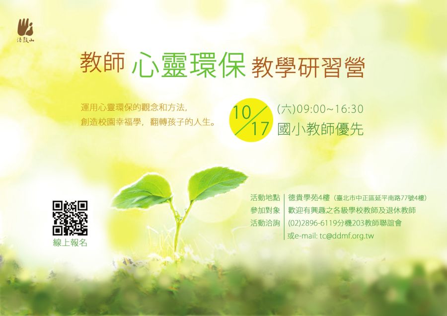 法鼓山文教基金會訂於109年10月17日(週六)辦理「教師心靈環保教學研習營」活動,詳如說明。