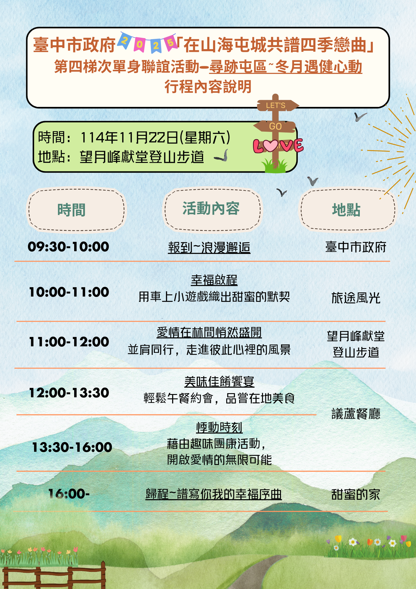 主旨:檢送臺中市政府2025「在山海屯城共譜四季戀曲」單身員工聯誼活動計畫及第三、四梯次行程內容說明各1份,請查照。