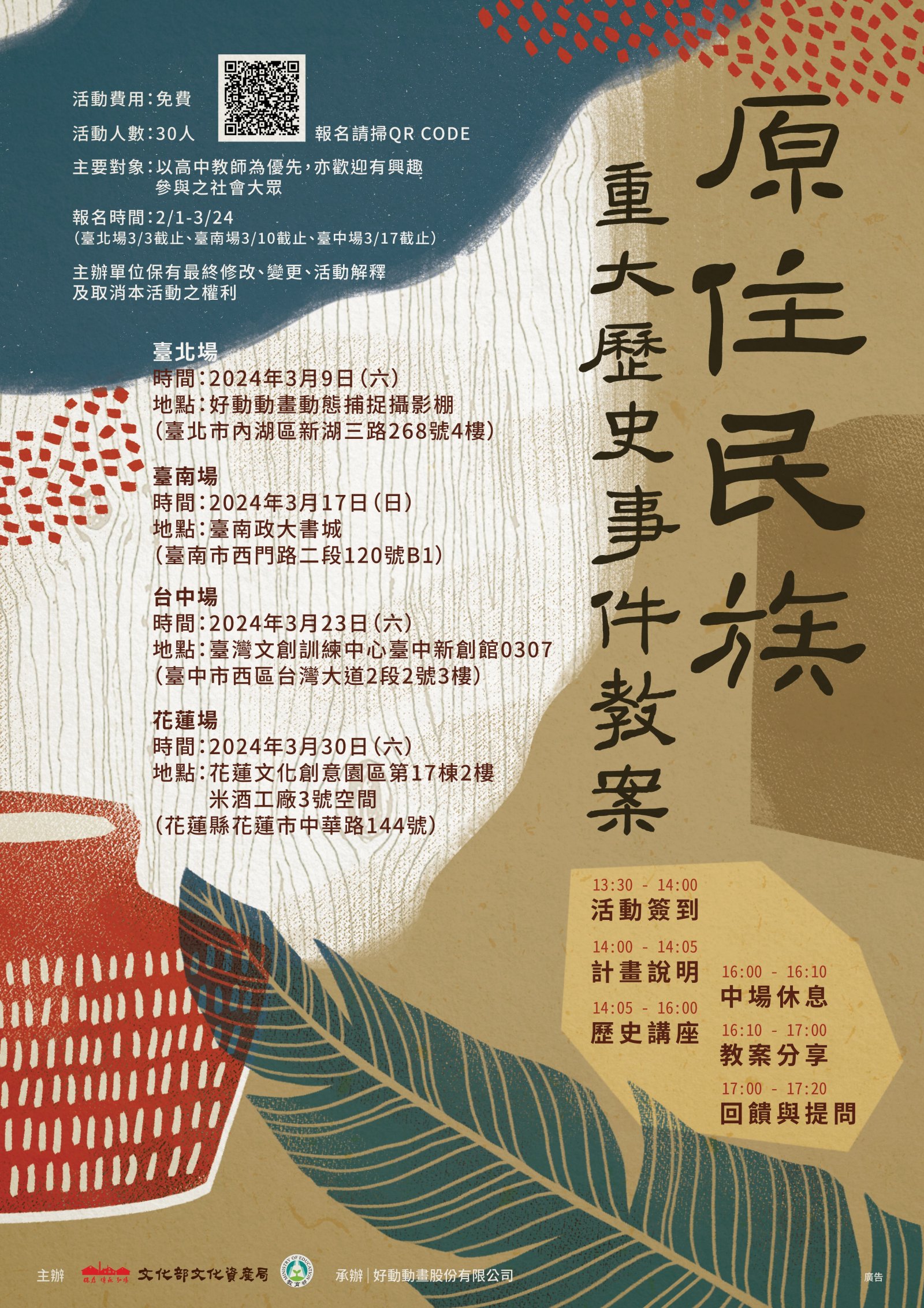 (四)花蓮場:113年3月30日(週六)花蓮文化創意園區第17 棟2樓米酒工廠3號空間(花蓮縣花蓮市中華路144 號)。