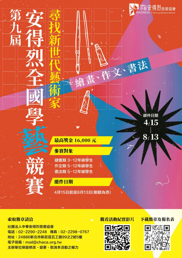 一、安得烈慈善協會(以下簡稱本會)為增進台灣偏鄉、清寒弱勢家庭學生閱讀寫作、美術繪畫及書法的興趣與能力,特別舉辦學藝競賽活動,以激發學生在文字、繪畫方面的想像力與創作力,並提升書法美學,鼓勵學生發揮才華。