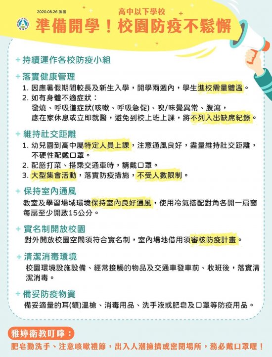→幼兒園到高中 #屬特定人員上課,注意通風良好,盡量維持社交距離,不硬性配戴口罩。