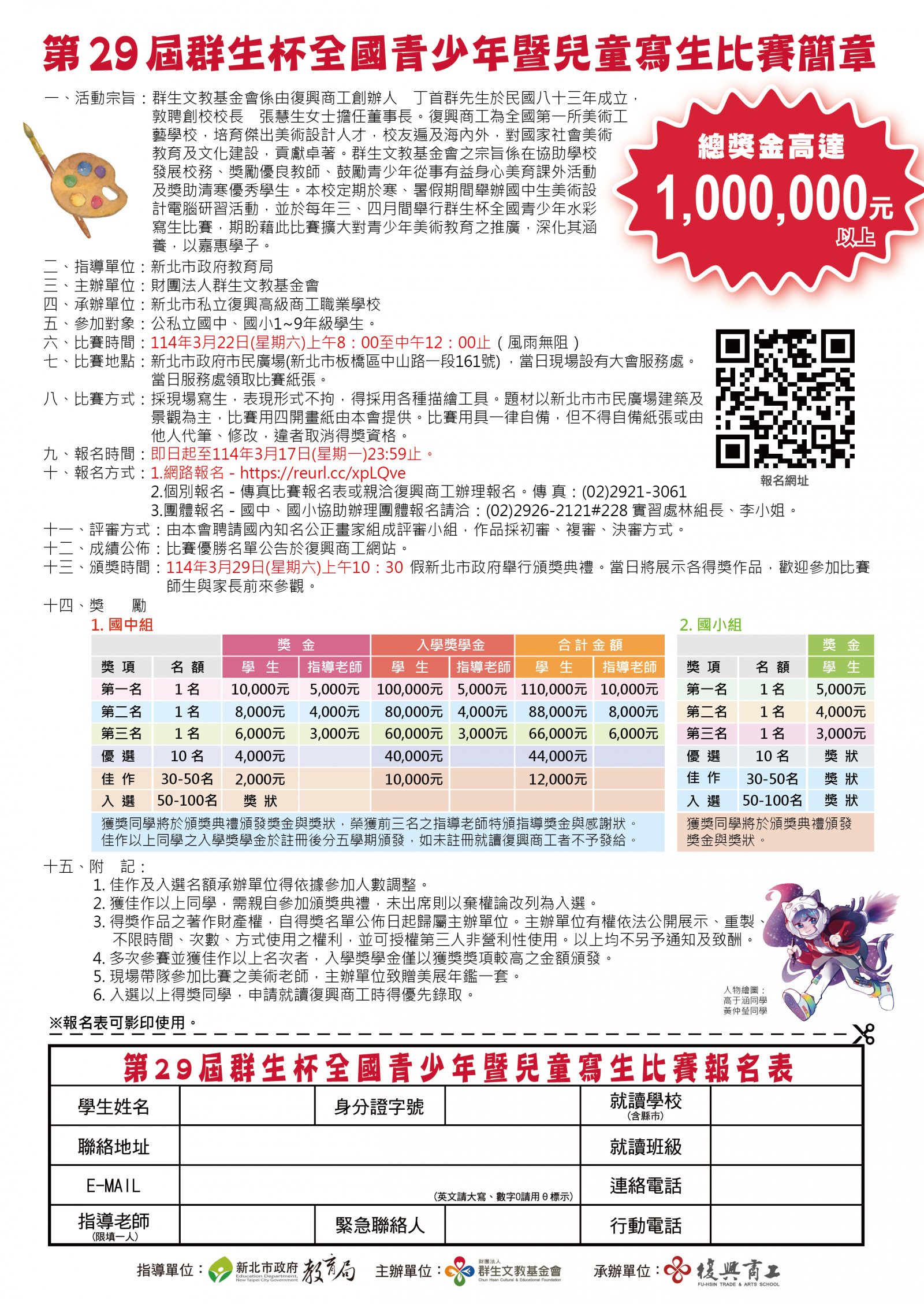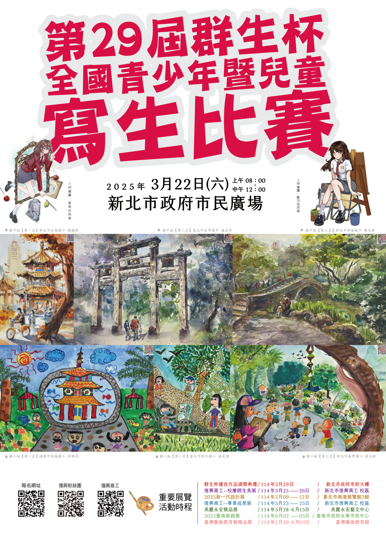 說明:一、比賽時間:114年3月22日(星期六) 上午8~12時。(風雨無阻)。 二、比賽地點:新北市市民廣場,廣場內所有可供寫生範圍皆可,中央舞台設有服務台領取比賽紙張。 三、比賽方式:採現場寫生方式,題材以新北市市民廣場建築及景觀為主,比賽使用四開畫紙,由本會提供,用具一律自備,採用任何描繪工具、材料皆可,表現形式不拘。不得自備紙張或由他人代筆、修改,違者取消資格。 四、國中組獲獎同學得入選以上獎狀者,畢業申請本校優先錄取。 五、線上報名網址: https://reurl.cc/xpLQve (即日起至114年3月17日(一)23:59止) 六、比賽簡章公告於群生基金會網站首頁 http://ischool.fhvs.ntpc.edu.tw/ischool/publish_page/193/,敬請下載查閱。