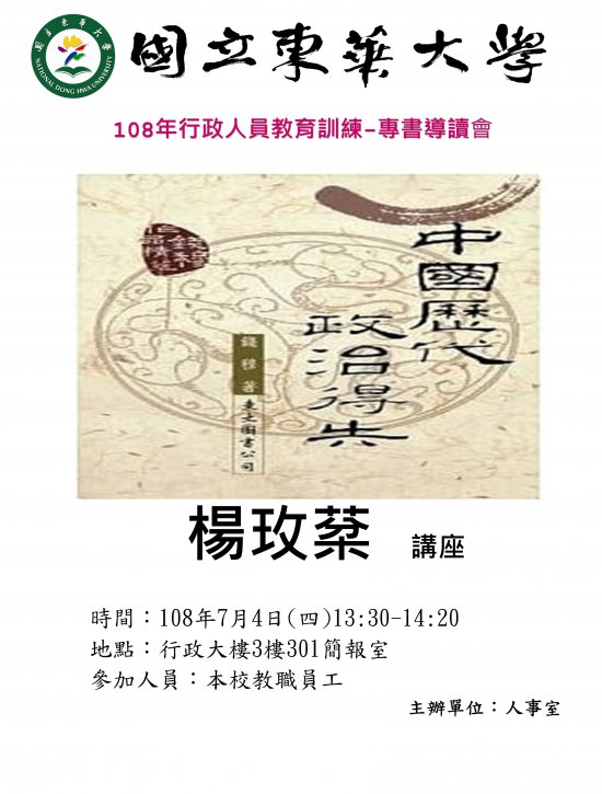 一、依據國立東華大學108年7月1日東人字第1080013598號函辦理。