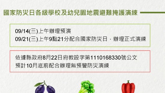 主旨:檢送本縣 111 年度國家防災日各級學校及幼兒園地震避難掩護演練實施計畫 1 份,請查照。
