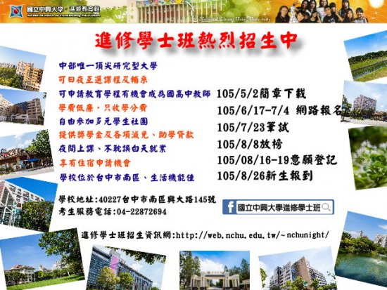 請參考:105學年度國立中興大學進修學士班招生宣傳簡介