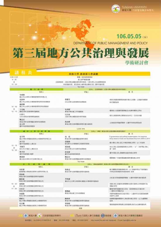 轉知「2017年第3屆地方公共治理與發展學術研討會」,歡迎貴屬人員自由報名參加,並於106年5月2日(星期二)前完成線上報名