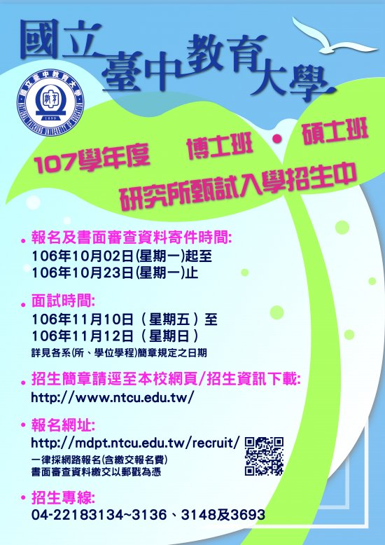 檢附國立臺中教育大學107學年度研究所甄試入學(碩士班及博士班)招生 資訊如說明(海報如附檔),請查照。