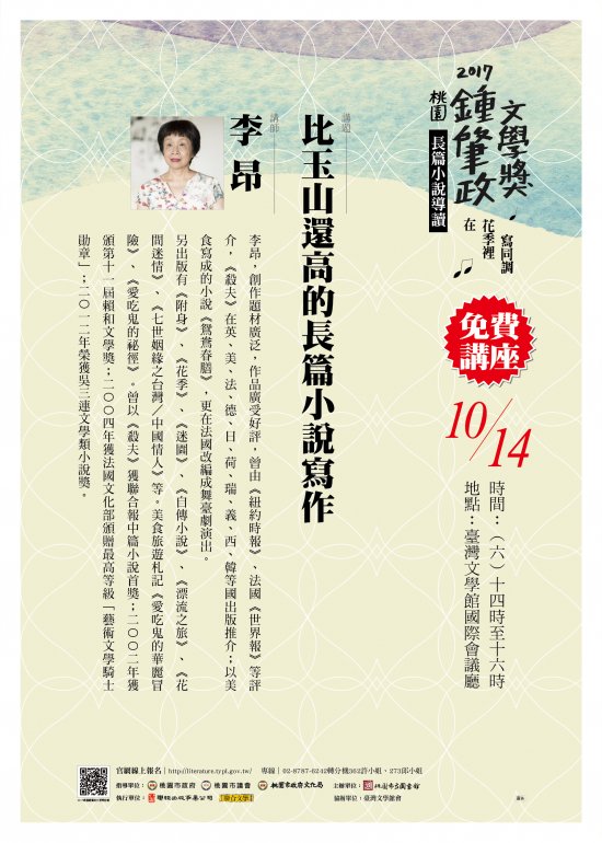 檢送桃園市立圖書館2017桃園鍾肇政文學獎10月14日長篇小說名家導讀「比玉山還高的長篇小說寫作」海報電子檔1份,另有長篇文徵稿,請同仁踴躍參加。