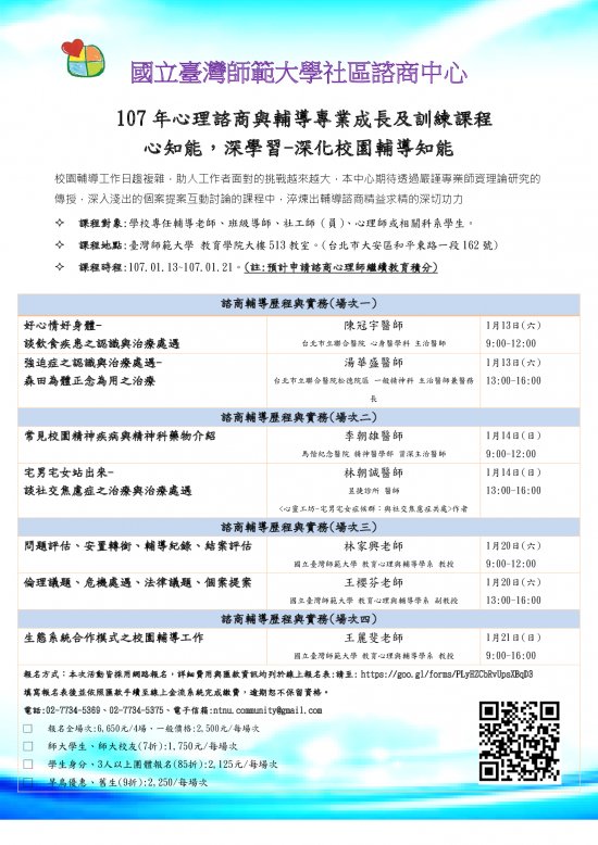 臺師大辦理「107年心理諮商與輔導專業成長及訓練課程」,歡迎有興趣的教職員自行報名參加
