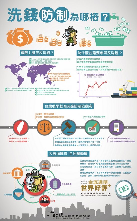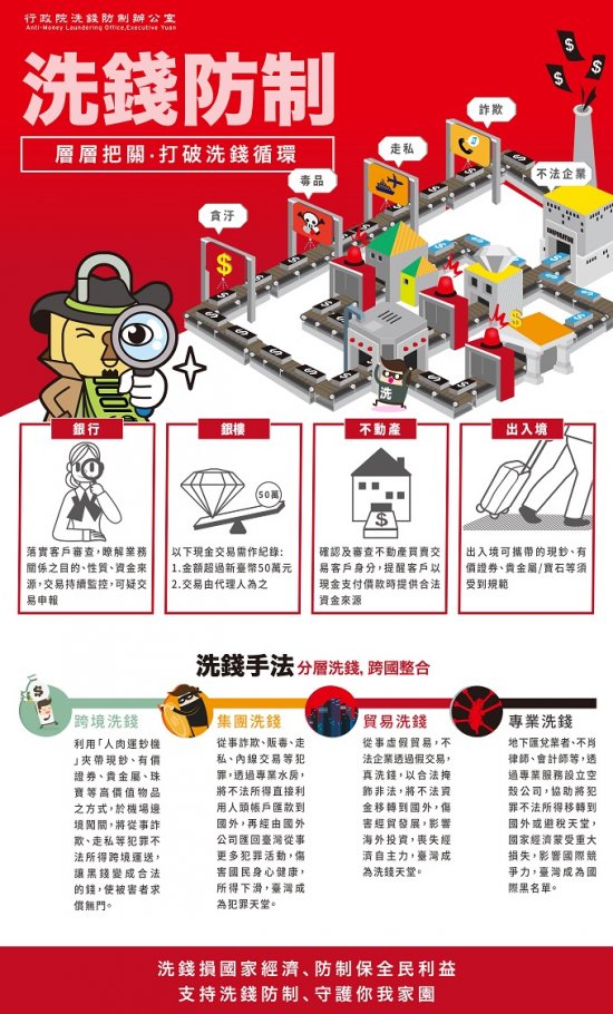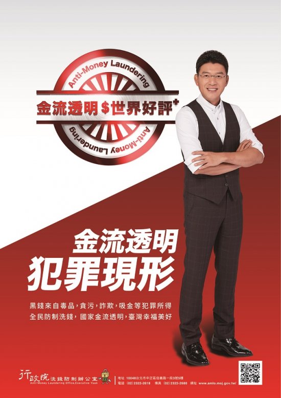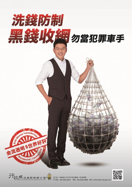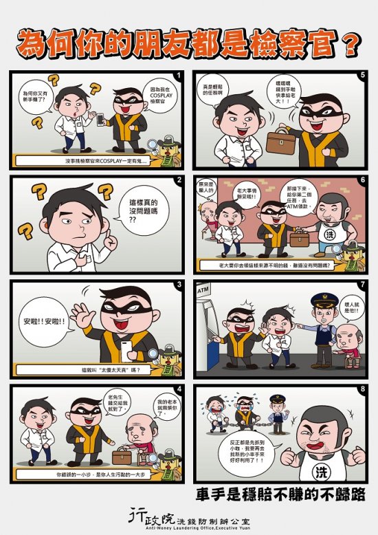 二、為因應今( 107 )年 11 月亞太洗錢防制組織來臺現地評鑑,並持續推動防制洗錢宣導工作,行政院洗錢防制辦公室今年度再推出「傻傻當人頭當成冤大頭」、「客戶詳審查金流有保固」、「冒險當車手錢入他人手」等 3 款電子海報(PDF 檔,如附件),惠請於貴機關及其所屬各單位、法人機構之官網、臉書、電子看板等通路登載,並善加運用,以提高國人防制洗錢的意識,有效遏止不法洗錢活動之發生。