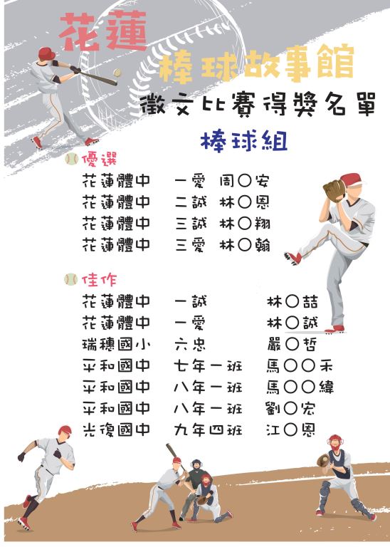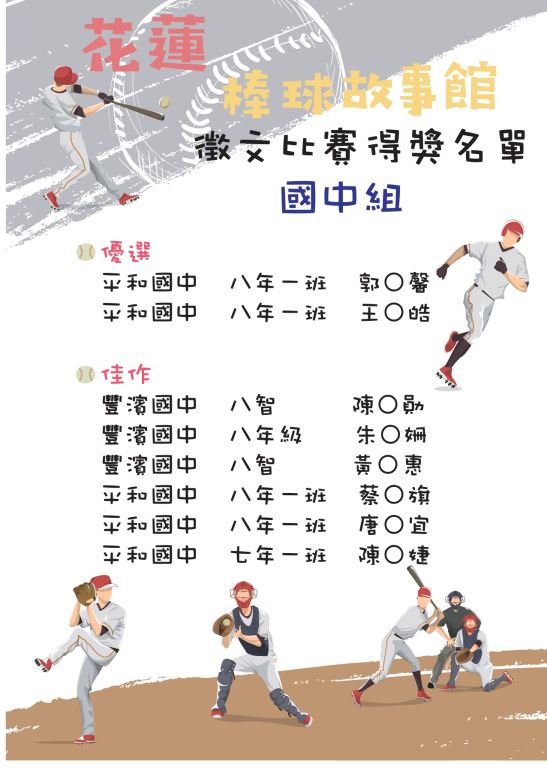 恭喜以下得獎同學: 【國中組】 >>優選: 平和國中 八年一班 郭子馨 平和國中 八年一班 王為皓 >>佳作: 平和國中 八年一班 蔡李旗 平和國中 八年一班 唐湘宜 平和國中 七年一班 陳妤婕